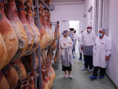 Guiado por Prudencio Benito, uno de los responsables de la empresa, y acompañado de la vicepresidenta de la Diputación, Sara Dueñas, y de los diputados Basilio del Olmo y José Antonio García, Miguel Ángel de Vicente conoció las instalaciones de la fábrica, así como los distintos procesos en la producción de los jamones de Bellota Ibérico, paletas de Bellota Ibérica, lomos de Bellota Ibérico y Serranos que cada día se elaboran de forma artesanal en estas instalaciones.