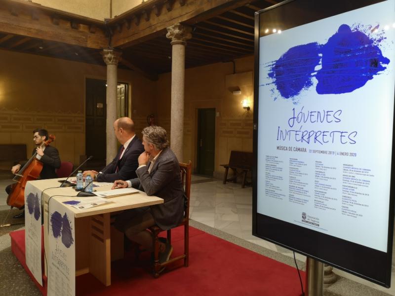 Las notas del violonchelo de Pedro Martín, de la formación Cuarteto Picos, daban la bienvenida al Patio de Columnas del Palacio Provincial para presentar la segunda edición del programa Jóvenes Intérpretes impulsado por el Área de Cultura, Juventud y Deportes de la Diputación de Segovia. Ocho serán las formaciones que este año participen en este proyecto que llegará a veinte municipios de la provincia, ocho más que en la pasada edición.
